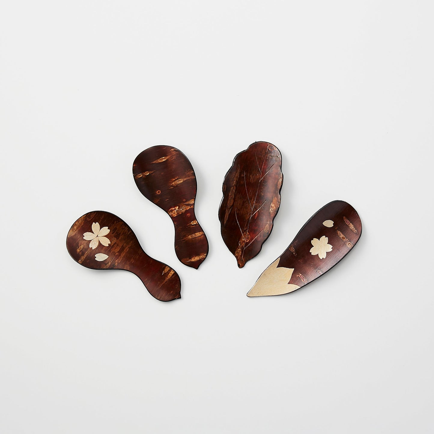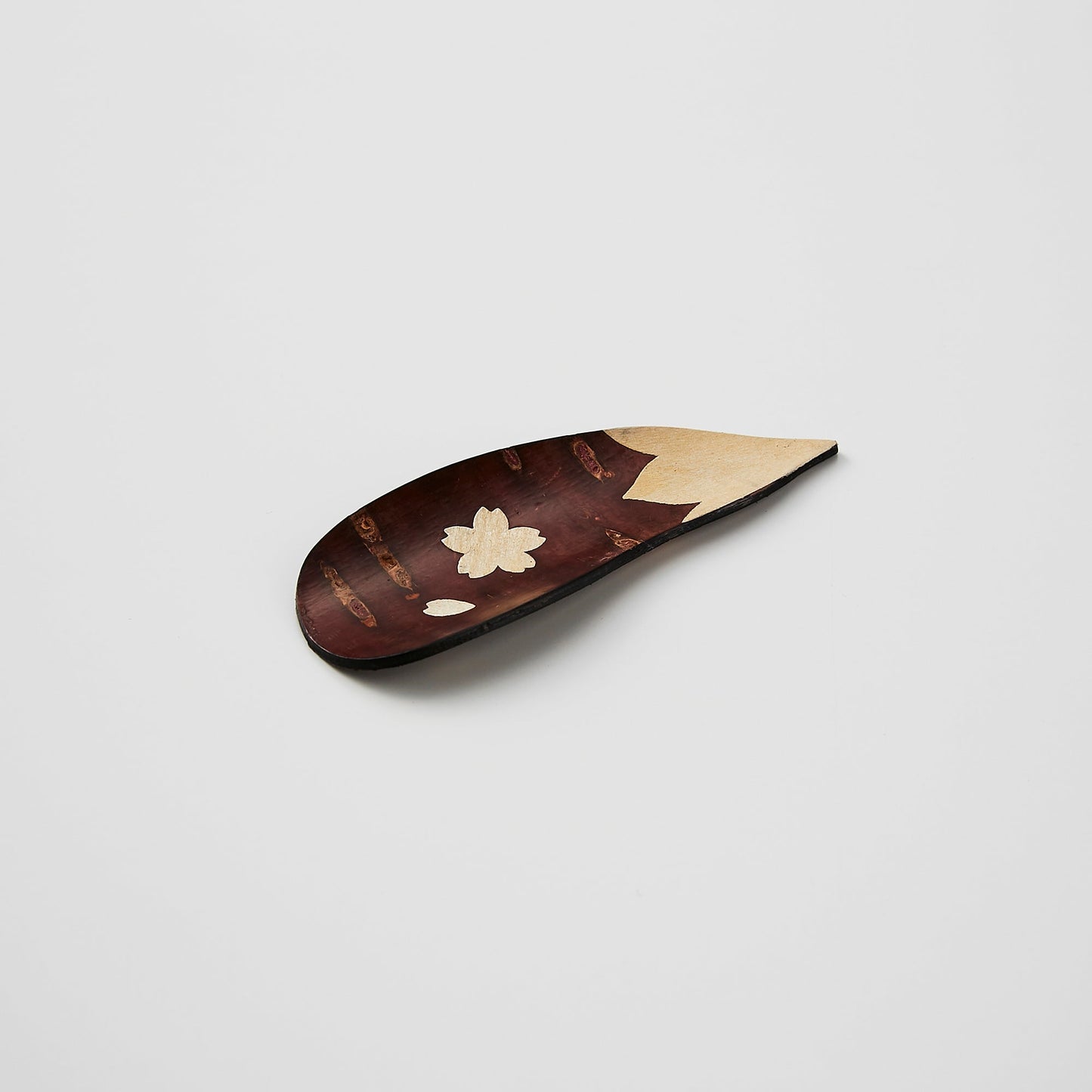 This tea scoop is for taking tea leaves out of a tea caddy. Cherry bark is applied to the surface of the tea scoop, shaped into an eggplant, and is accented with lovely Sakura (cherry flowers), made with Japanese Wingnut. As cherry bark is antibacterial, it can be placed back into the tea caddy after being used.