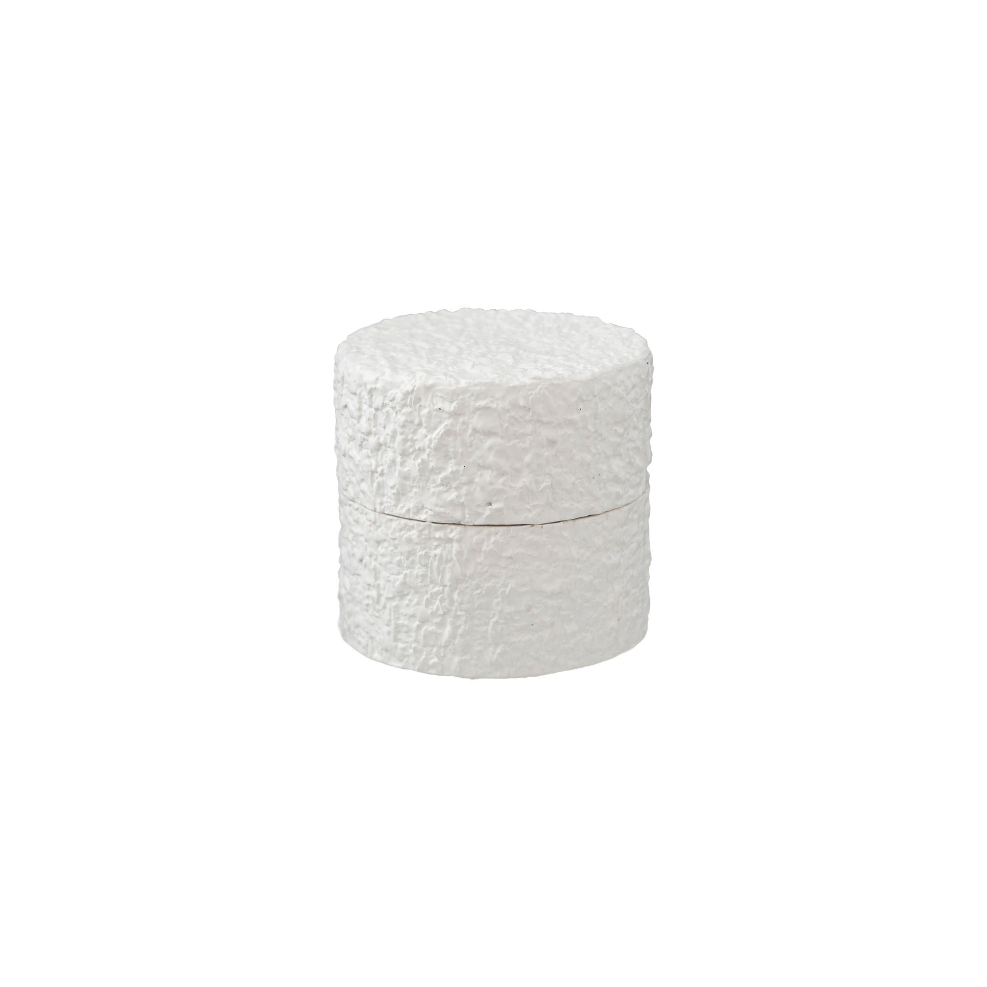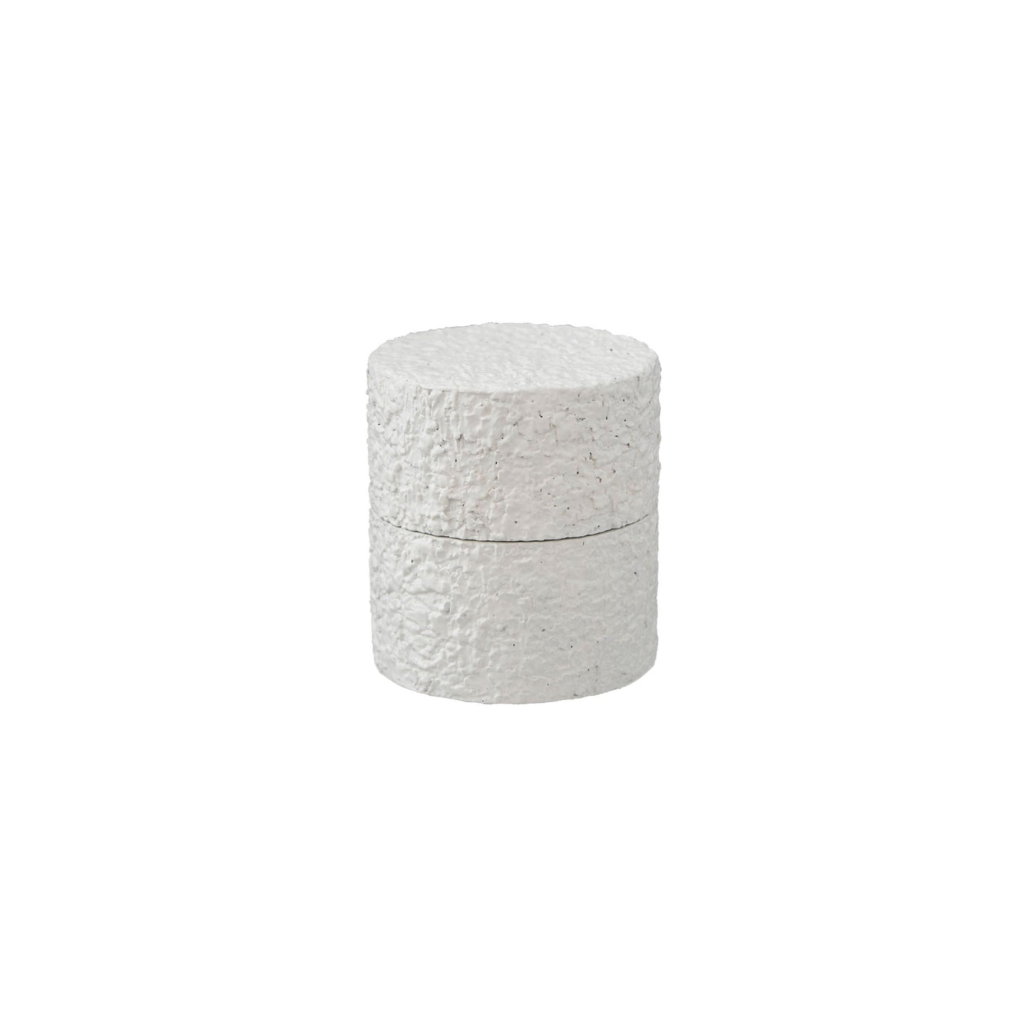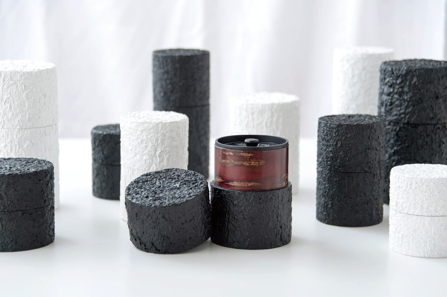 樺細工を今日的な視点で見直し、現代的な魅力を持つ工芸へとアップデートするプロジェクトのひとつ。山桜樹皮の持つ有機的な凹凸の魅力を引き出すよう、白または黒のマット塗装を施しました。これにより伝統的な樺細工の工法では難しかった材料の使用が可能となり、樺はぎ(山桜樹皮の剥き子さん)の人々の想い、職人の技を一つひとつに込めることができました。また内部は伝統的な工法で仕上げられ、赤く磨かれた伝統色が外装との美しいコントラストを生んでいます。